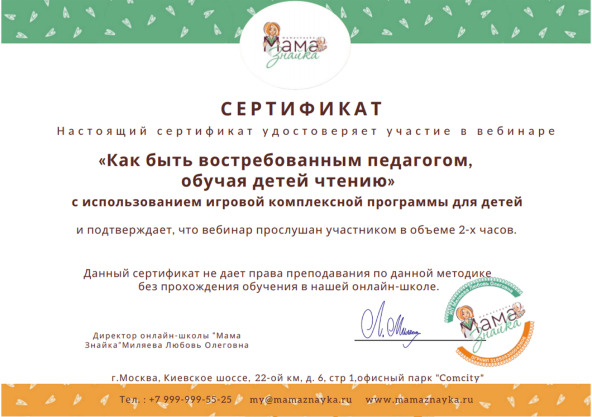 В конце вебинара вы получите сертификат о посещении и подарок — «Тренажёр для слияния слогов».
